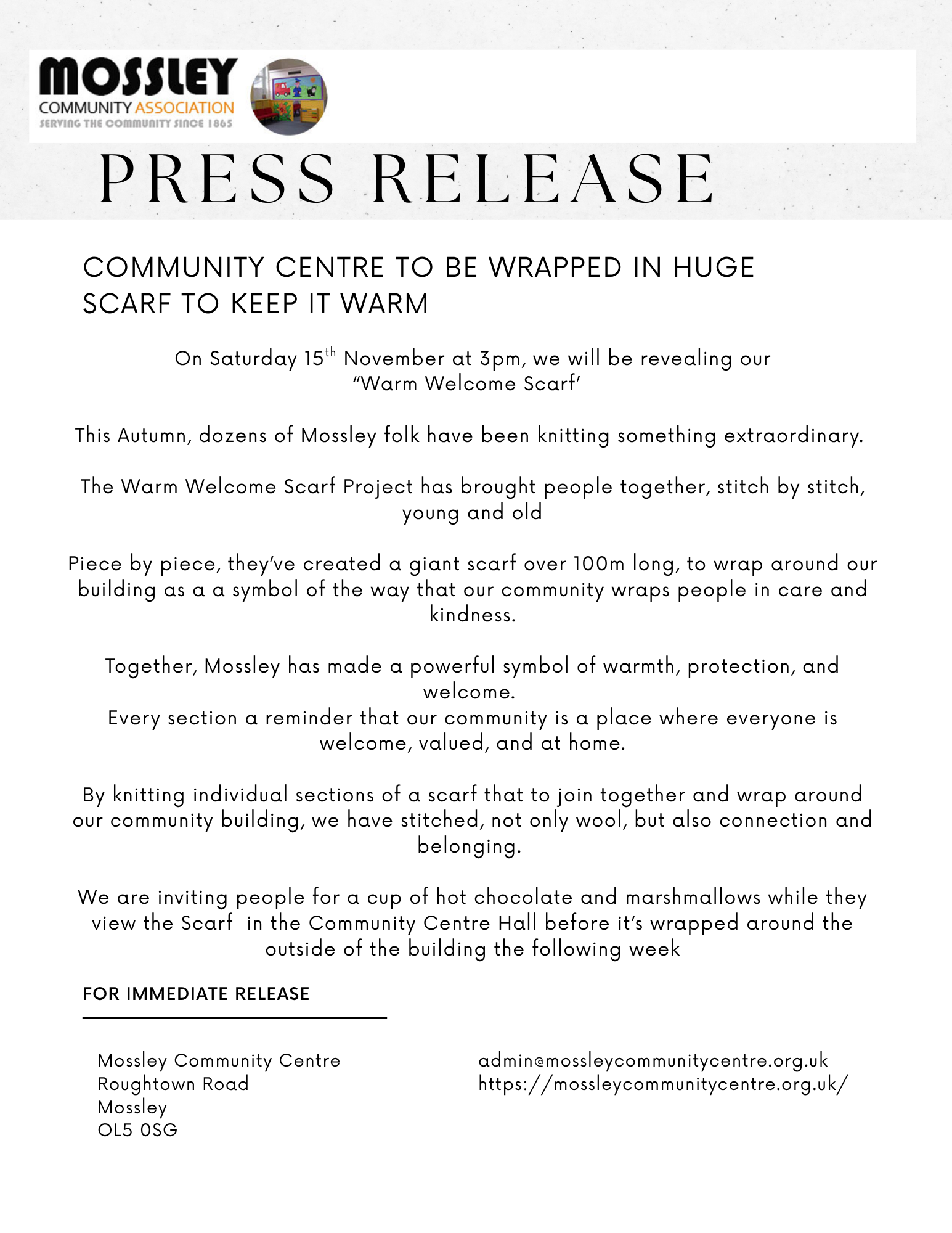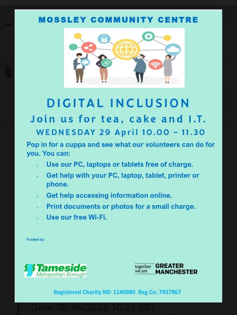 If you would like further information about anything you can’t find here, then please ring our Co-ordinator Angie Taylor on 01457 832361, email admin@mossleycommunitycentre.org.uk, or via messenger on our Facebook page.