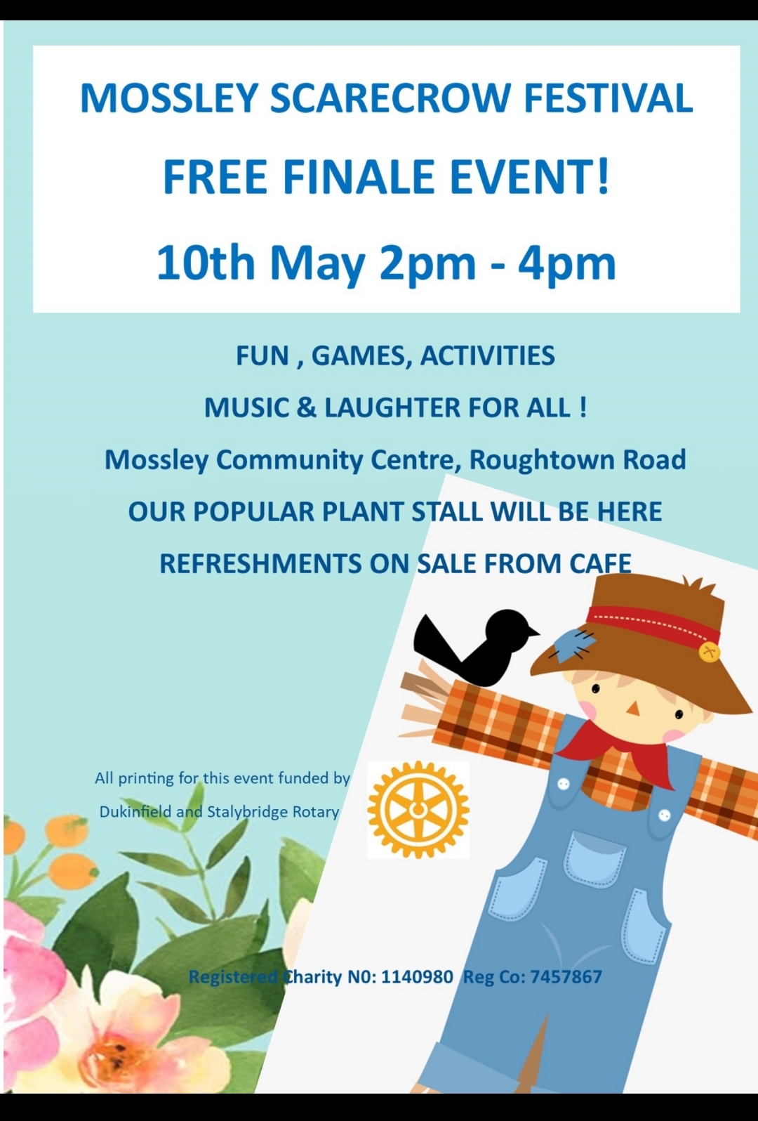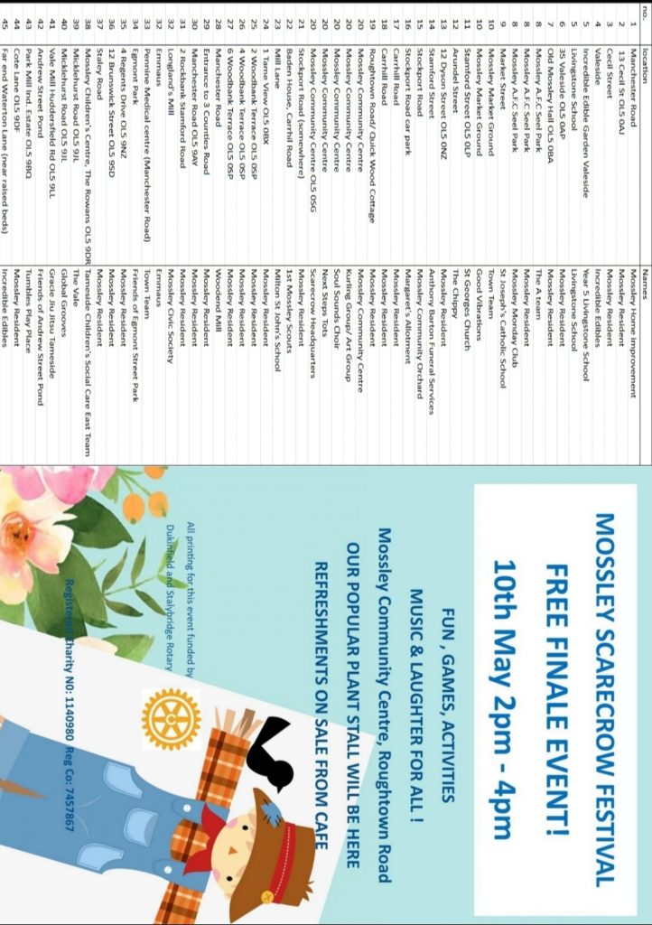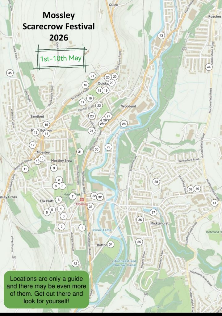Scarecrow Festival May 2026 register your location by e mailing admin@mossleycommunitycentre.org.uk to be included on the map. Maps will be available from 28th April from Mossley community centre, Emmaus and Anthony Barton