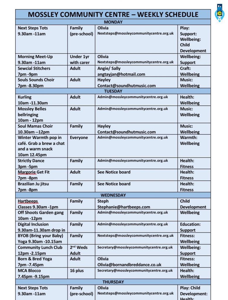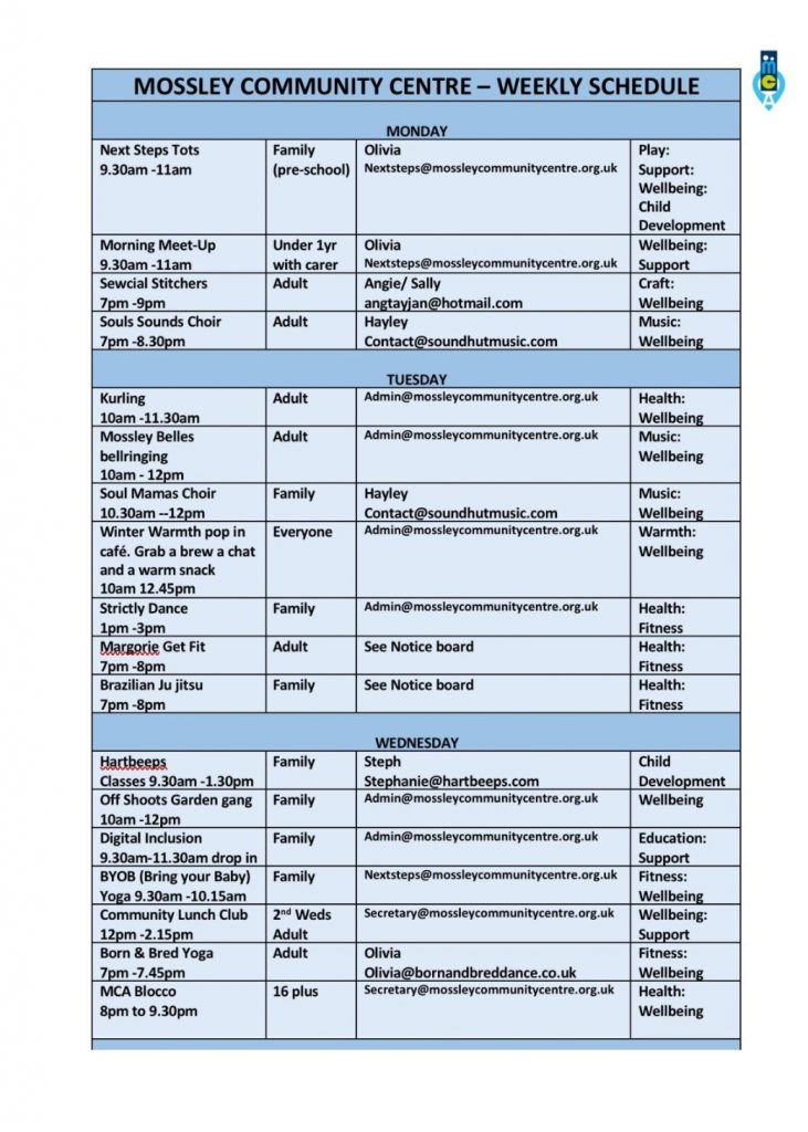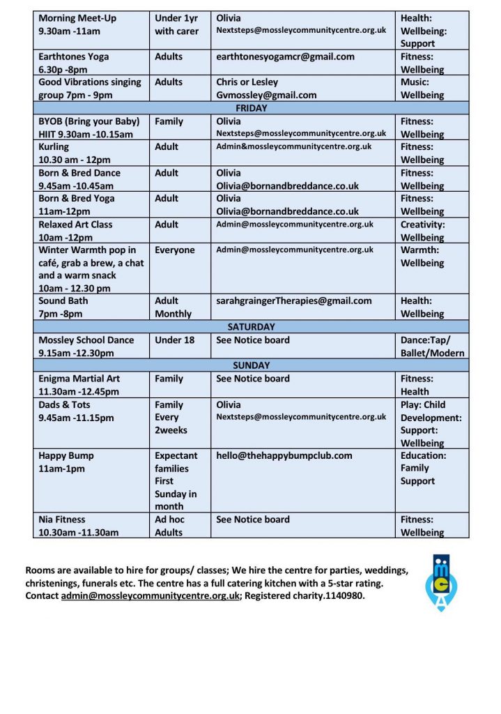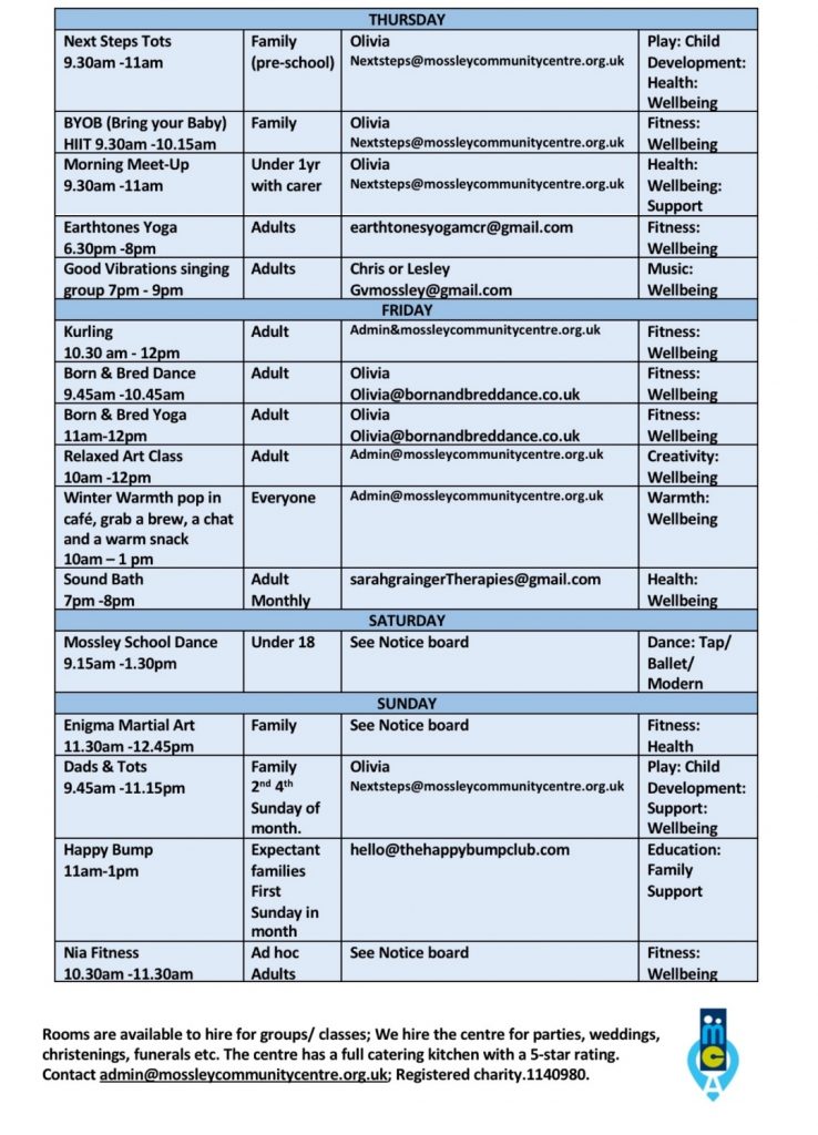 Monthly Lunch Club, : 12.00 pm – 2.00 pm ( monthly ) contact secretary@mossleycommunitycentre.org.ukBorn and Bred Dance Theatre