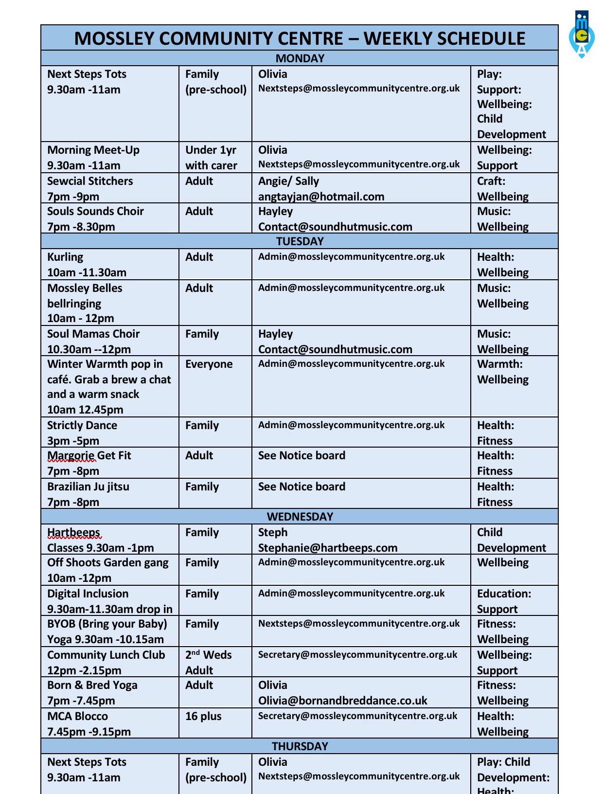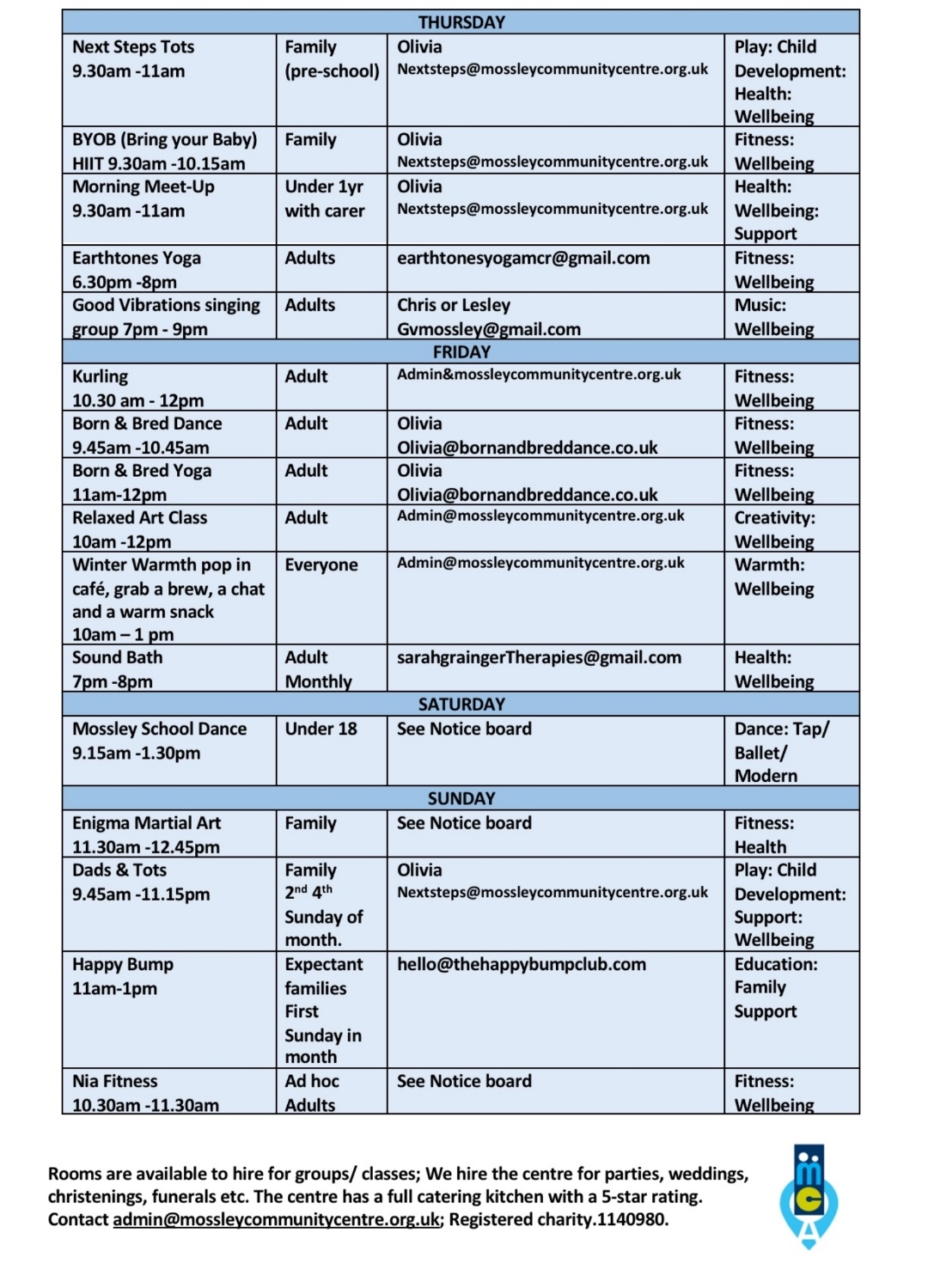 There are many activities for all ages are held at the Centre. Below is our weekly programme – please click on the name of the group you are interested in to view more details and check availability of spaces. Please watch out in our news posts for our special events that take place throughout the year